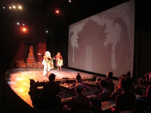 The plot offers an exciting feast for the senses, ranging from scenes depicting ideal love and loyalty, to dramatic battle scenes replete with intrigue and unexpected turns — all brought to life on a large 30’ x 15’ screen through shadow puppetry, stylized acting, dance, and original live Balinese gamelan music. Comic relief and narration of the ensuing confrontation is provided by the beloved punakawan or clown characters.